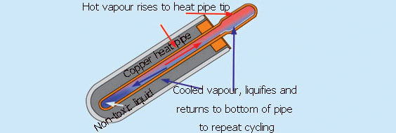 Heat pipe vacuum tube consists of two parts, all glass evacuated tube and copper heat pipe. Heat is transferred via heat pipe. When super conductive fluid inside copper pipe is heated, it evaporates and transfers energy to its vapour then condenses, and fluid returns to its original position due to gravity.